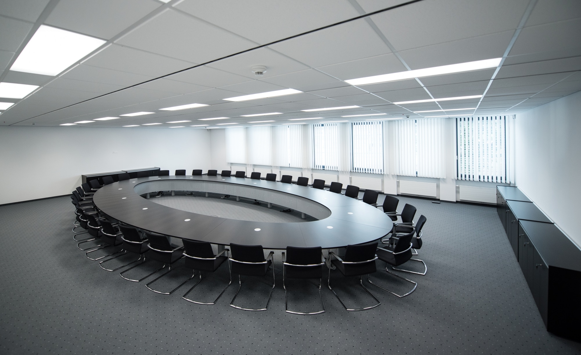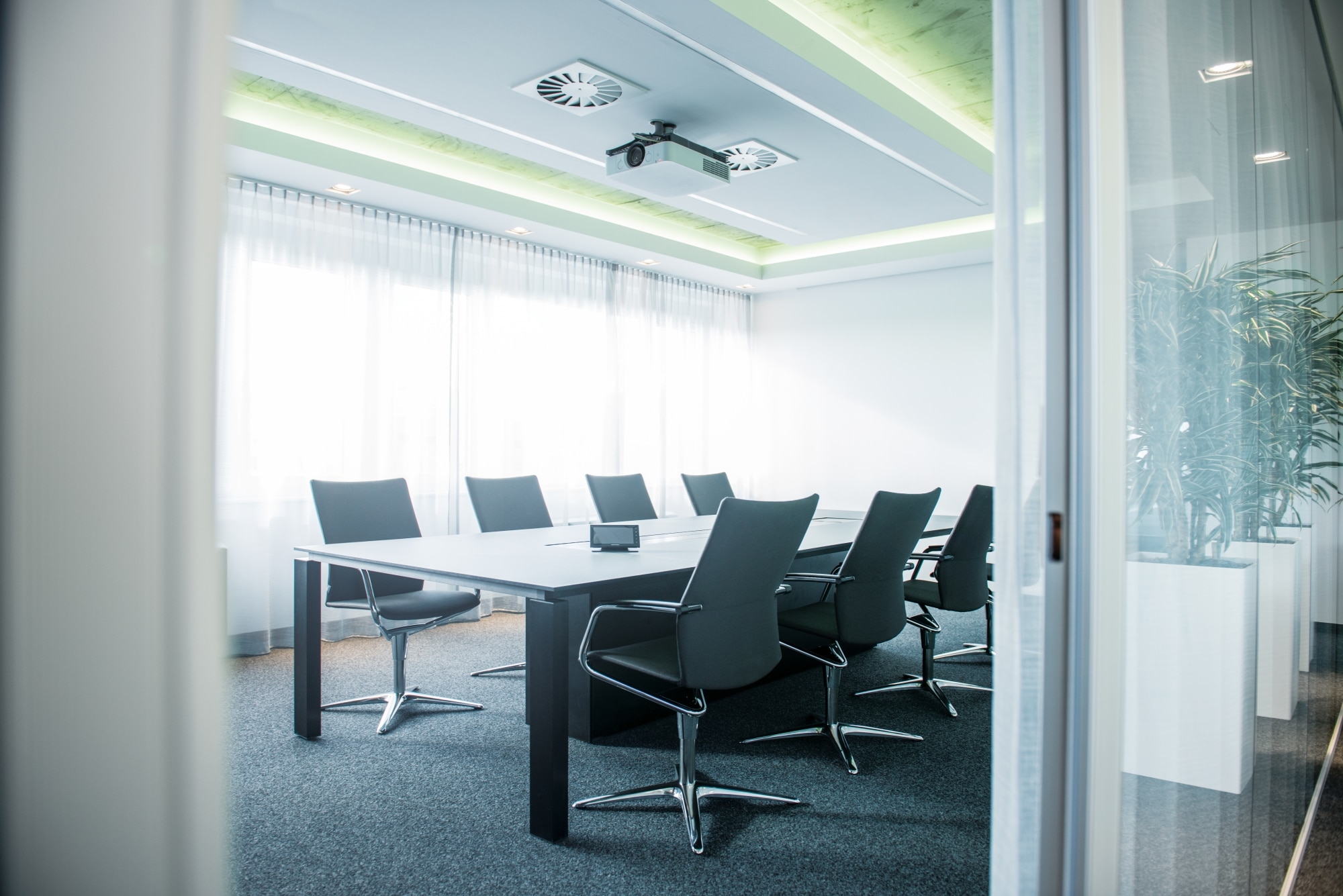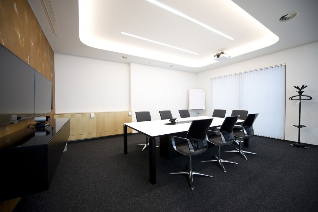 Zu den Must-haves im Konferenzraum zählen neben passenden Konferenzstühlen und Konferenztischen auch genug Steckdosen und Anschlüsse, gute Belüftungsmöglichkeiten sowie eine ausreichende Beleuchtung. Da bei vielen Meetings auch ein Beamer, ein großer Bildschirm oder ein Whiteboard zum Einsatz kommt, sollte an den Fenstern außerdem eine entsprechende Verdunkelungsmöglichkeit vorhanden sein.