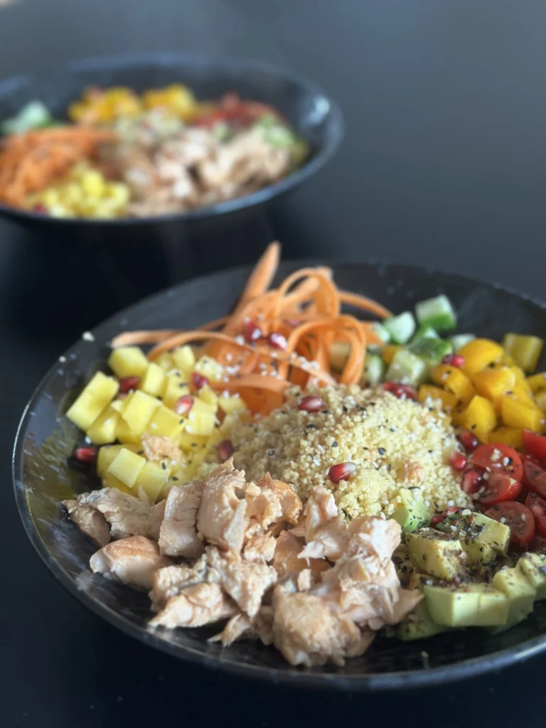 Als Basis für die Bowls eignen sich Reis oder Couscous, die einfach nach Packungsanleitung zubereitet werden. Im nächsten Schritt wird der Lachs oder das Hühnerfilet in mundgerechte Stücke geschnitten und mariniert. Der Lachs wird mit Zitronensaft, Soja- und Teriyakisauce, Knoblauch und etwas Öl mariniert, während die Hühnerstücke mit Hähnchengewürz, Knoblauch und etwas Öl mariniert werden. Nun wird das Gemüse (und Obst) geschnitten. Alles, was der Kühlschrank hergibt und gut schmeckt, ist erlaubt – je bunter, desto besser. Beliebtes Gemüse sind Karotten, Gurken, Tomaten, Frühlingszwiebeln, Paprika, Avocado und für die fruchtige Note etwas Mango. Den gekochten Reis oder Couscous mittig in einer tiefen Schüssel anrichten und die restlichen Zutaten rundherum verteilen. Der Bratensatz wird mit etwas Wasser und Soja- bzw. Teriyakisauce abgelöscht und als Dressing über das Gemüse und den Reis gegossen. Mit diesen vielfältigen Zutaten zauberst du dir ein gesundes Mittagessen im Büro, das dich den ganzen Tag über mit Energie versorgt.