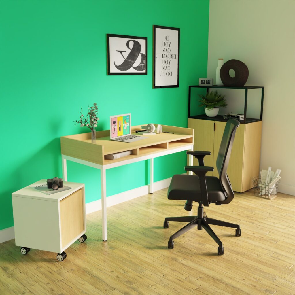 - Bester Arbeitskomfort: Wer in der Ausführung der Möbel noch eine Stufe höher gehen möchte, kann das Homeoffice zudem mit einem höhenverstellbaren Tisch aufpeppen. Das Aufstehen zwischendurch entlastet dabei nicht nur den Rücken, sondern beflügelt darüber hinaus auch die Konzentration. Für optimalen Arbeitskomfort sorgt außerdem ein Drehstuhl mit dynamischem Rückennetz sowie ein funktionaler Drehtürenschrank.