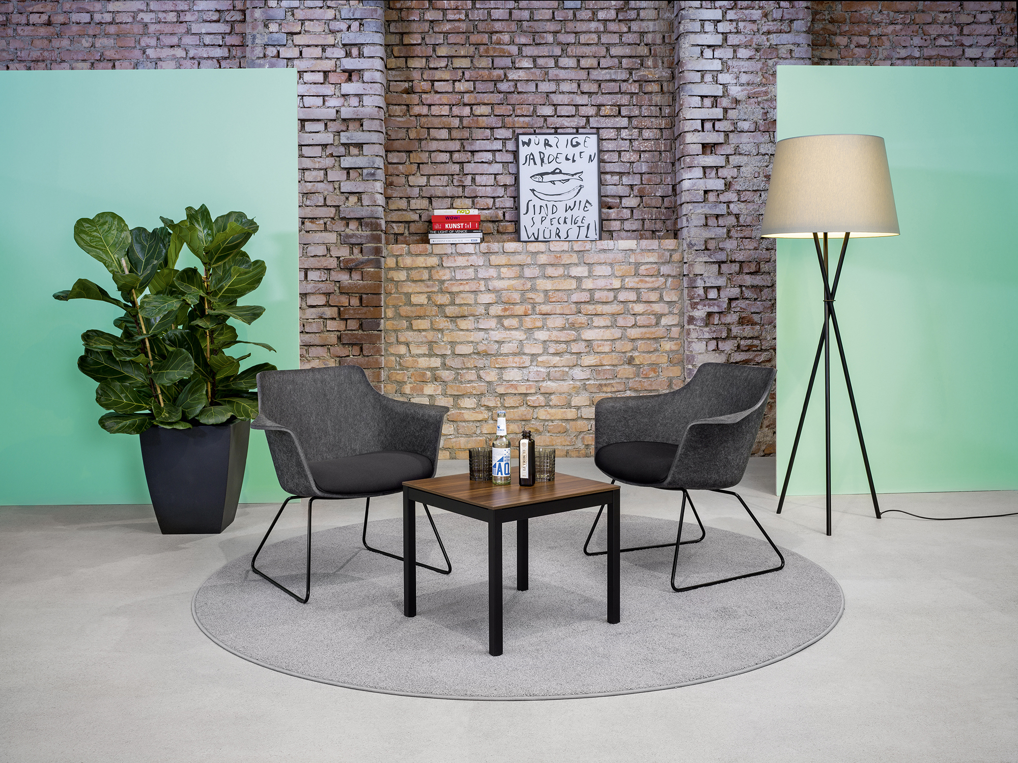 Zwei graue Lounge-Stühle mit Couchtisch auf rundem Teppich in gemütlicher Meeting-Ecke