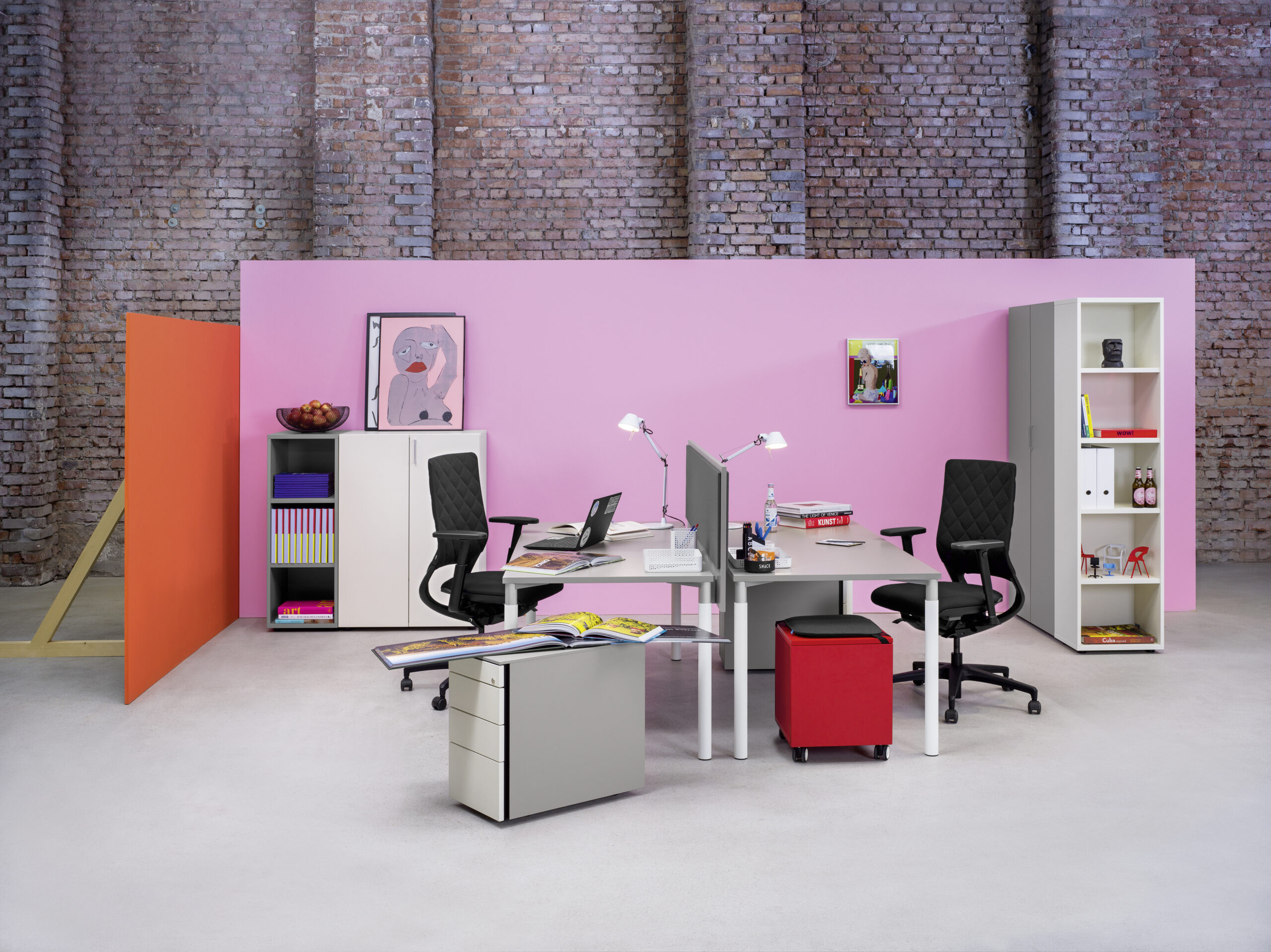 Flexible Bürolandschaft mit s440 Arbeitstisch, Stauraumvarianten und mobilen Bully-Hockern