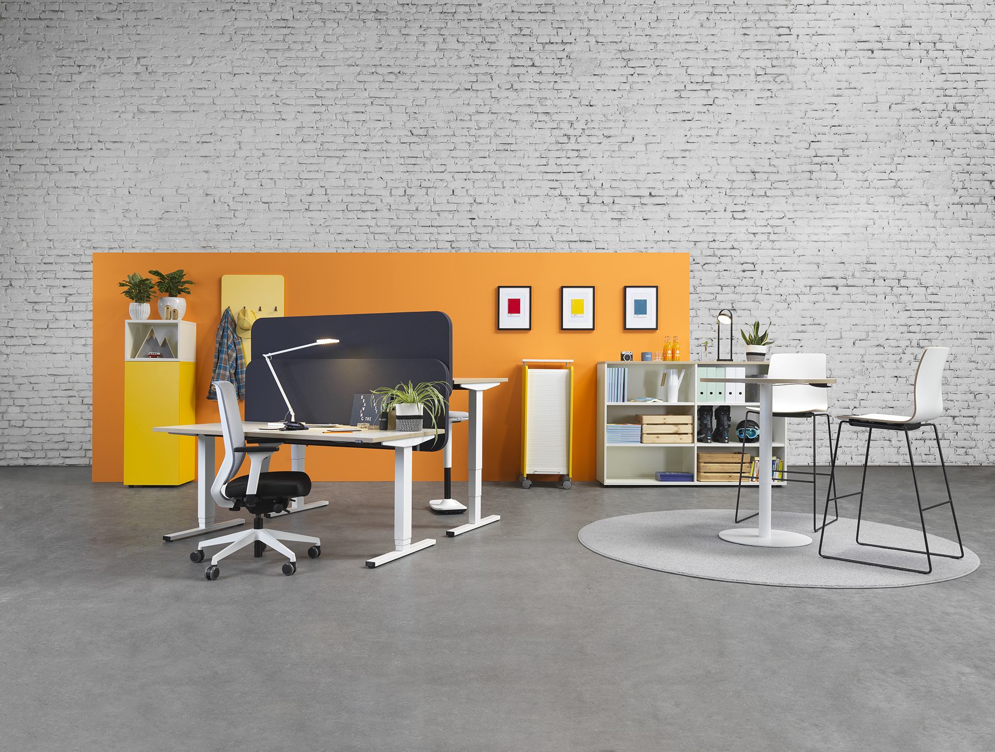 Zwei Arbeitsplätze mit weißen Sitz-Steh-Tischen, Stauraumregalen und oranger Wand