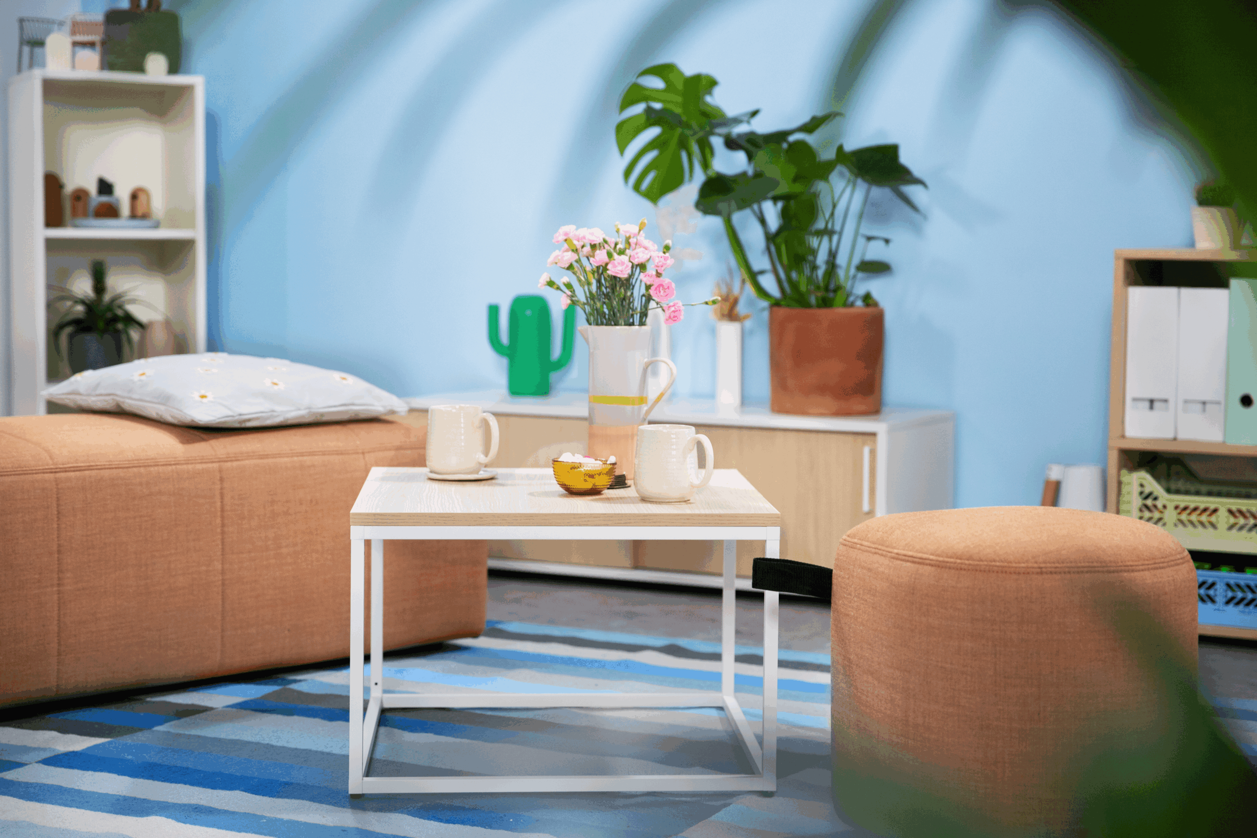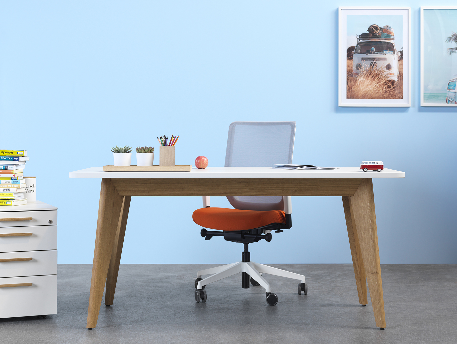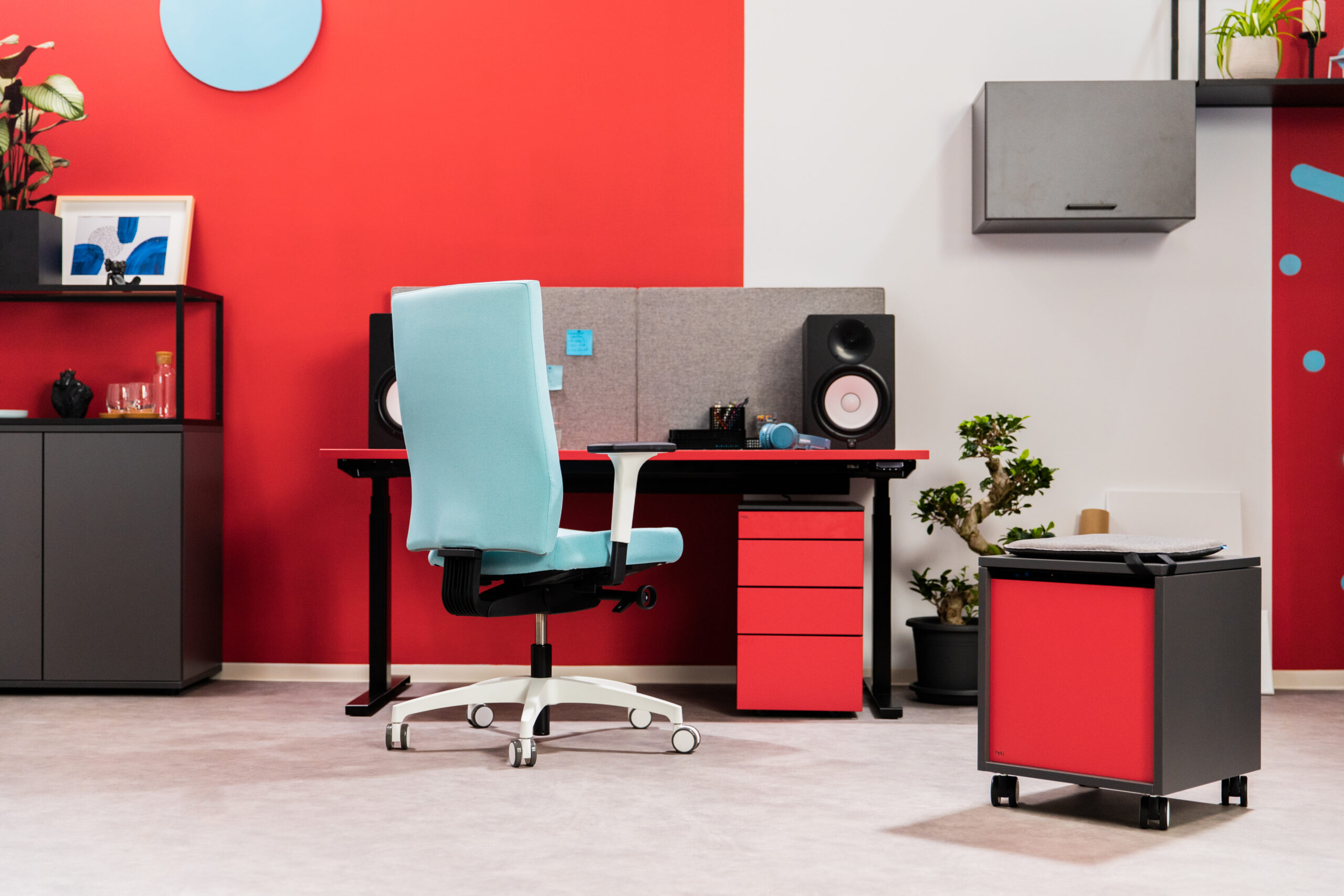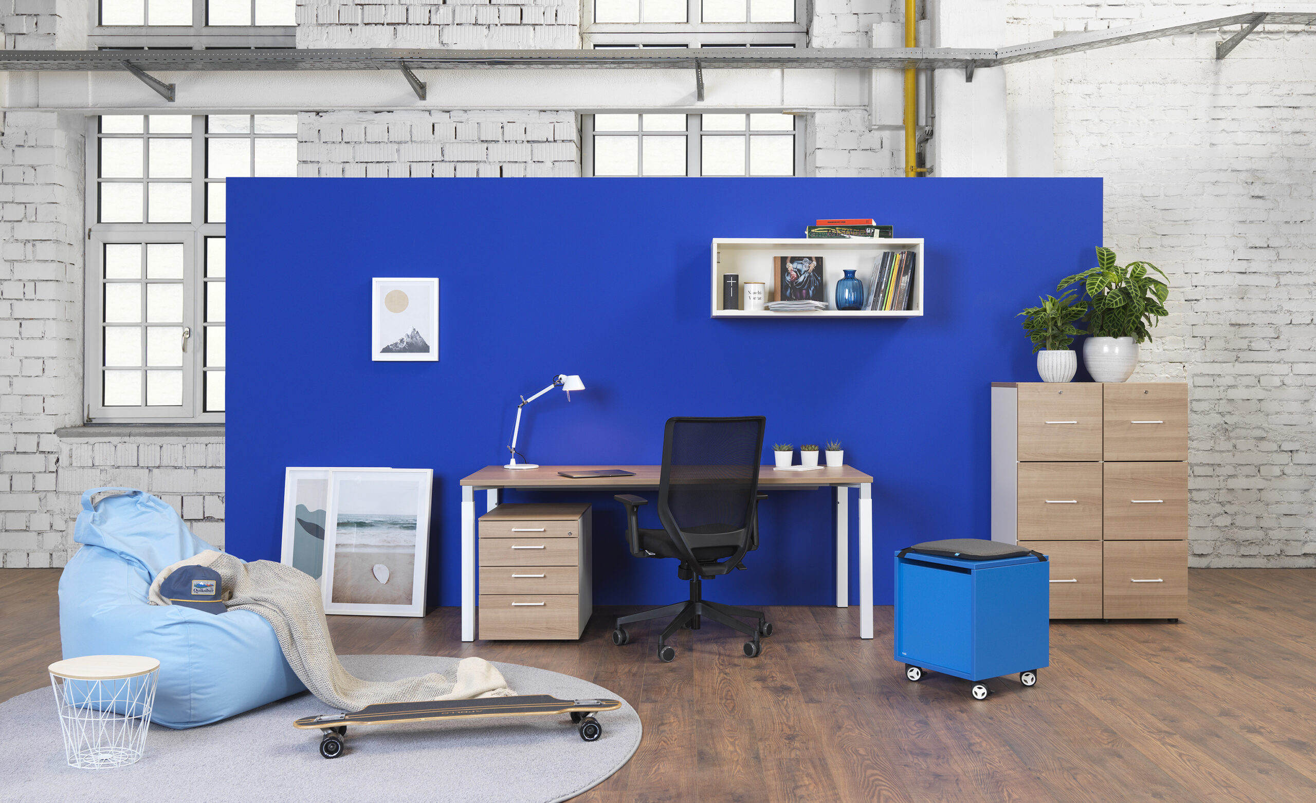 Homeoffice-Bereich mit Sitzhocker Bully, Schreibtisch und Skateboard vor blauer Wand