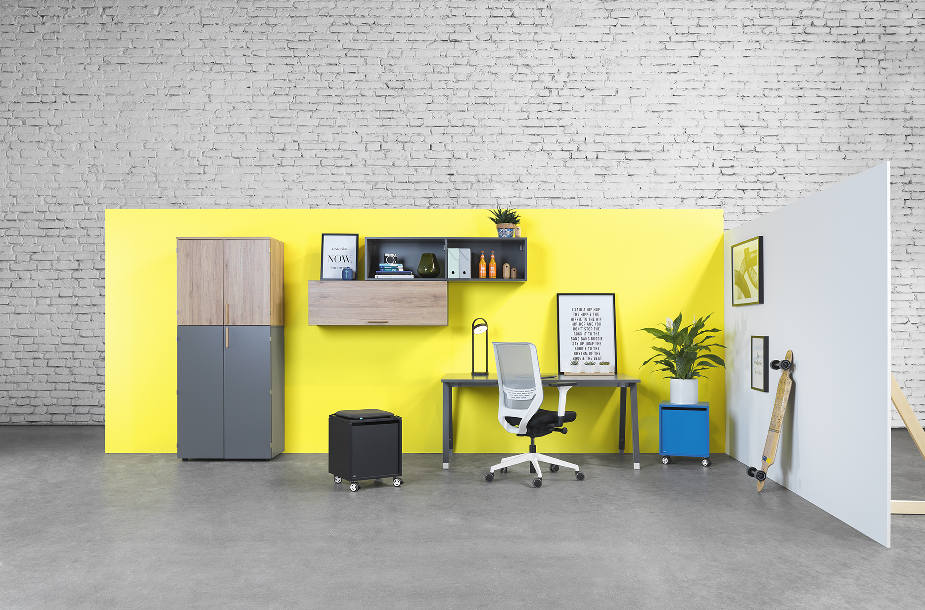 Büroszene mit Schreibtisch s120, Rollcontainern, Regalen und gelber Wand