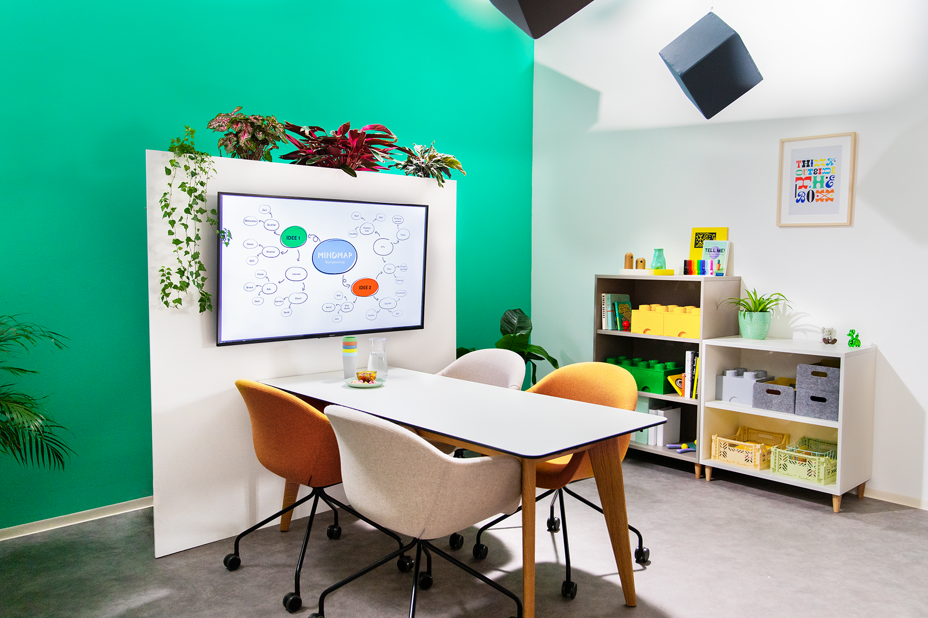 Modern eingerichteter Meetingraum mit hali Konferenztisch, gemütlichen Stühlen und Deko
