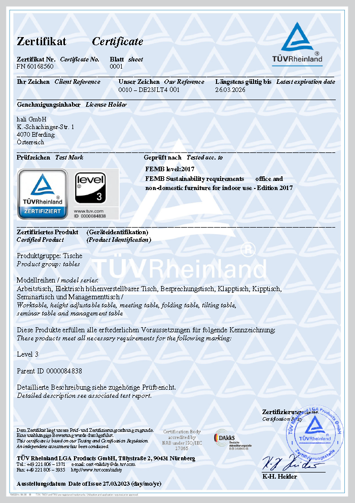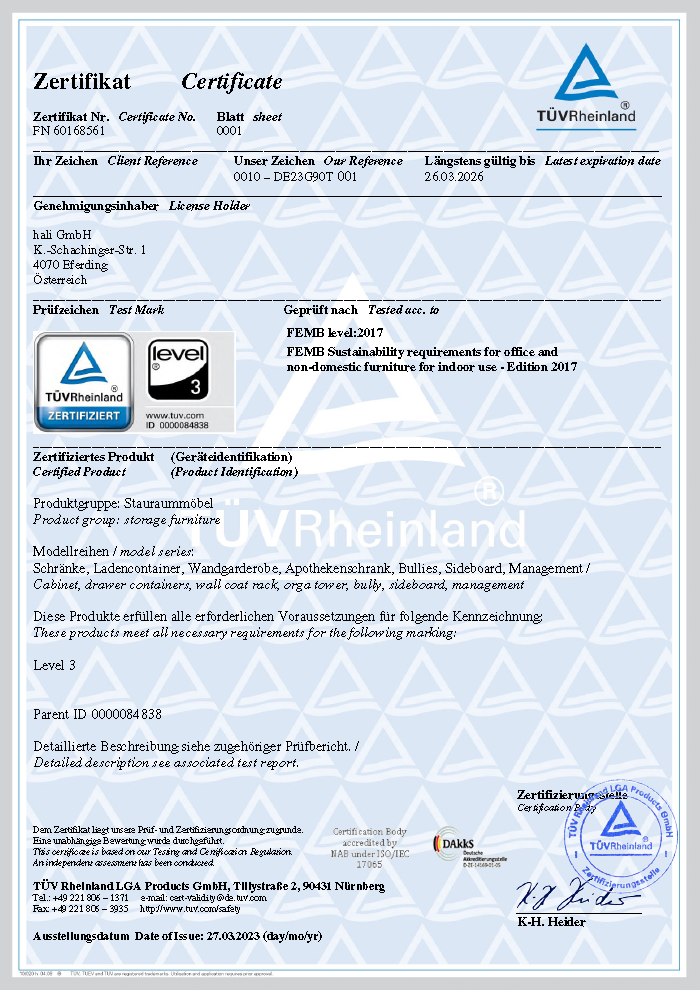Die Beschaffung qualitativ hochwertiger Rohstoffe ist bei hali oberstes Gebot für die Produktion von Büromöbeln. Alle Büromöbel, die melaminbeschichtet sind, sind deshalb mit dem österreichischen Umweltzeichen zertifiziert. Das ist bei hali die Prämisse. Mit der Bestätigung durch das Umweltzeichen unterliegen die Möbel sehr strengen Auflagen hinsichtlich Emissionen. Beispiellos schadstofffreie Innenraumluftwerte durch unsere ebenfalls schadstofffreien Möbel sind damit bewahrt. Den vielleicht unangenehm bekannten, künstlichen und ungesunden Geruch von neuen Möbeln gibt es bei Büromöbeln von hali nicht.