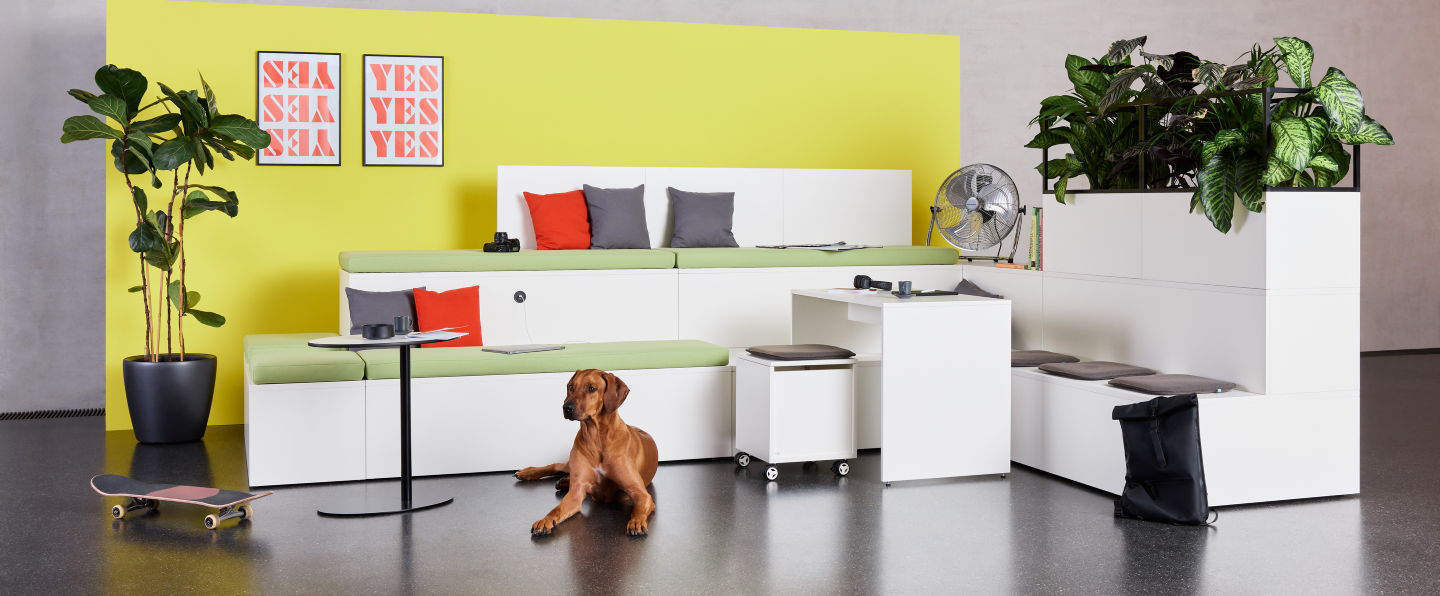 Offene Kommunikationsbereiche schaffen Raum für Austausch, frische Ideen und kreative Gedankenansätze. Durch das 4Cubes lassen sich individuelle Meetingzonen planen, die sich den Gegebenheiten des Büros anpassen. Ob kleine Meetingbereiche für 2 bis 3 Personen, Einzelarbeitsplätze oder größere Kollaborationszonen – mit dem 4Cubes ist alles möglich. Optional kann der 4Cubes Wangentisch als praktischer Arbeitstisch ergänzt werden. Der Wangentisch ist flexibel verschiebbar und kann bei Bedarf schnell beiseite geräumt werden.