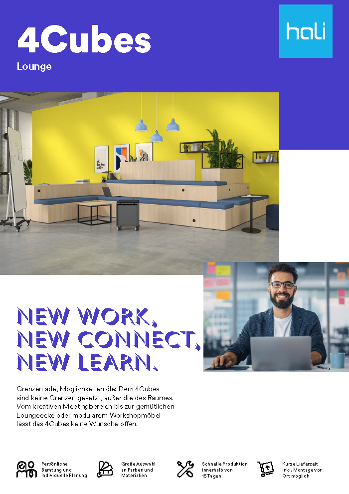 Das 4Cubes ist ein modulares Möbelsystem für Meetingräume, Lounges und Workshops. Mit optionaler Elektrifizierung, großer Dekorauswahl und robuster Konstruktion wird es zum vielseitigen Zentrum für Kommunikation und Zusammenarbeit.