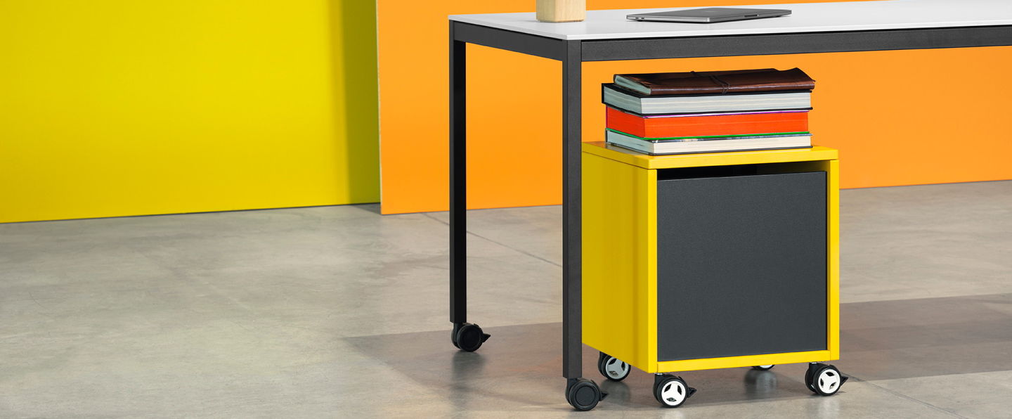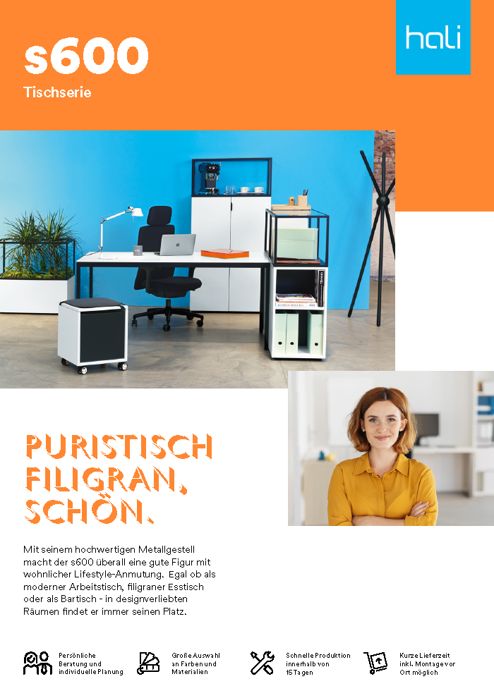 Erhältlich mit fixer Höhe, höheneinstellbar, in unterschiedlichen Breiten und Tiefen bietet die Serie maximale Flexibilität. Optional kann der s600 Arbeitstisch mit Kabelmanagement und Rollen ausgestattet werden. Alle Modelle sind in den hali-Kollektionsfarben verfügbar.