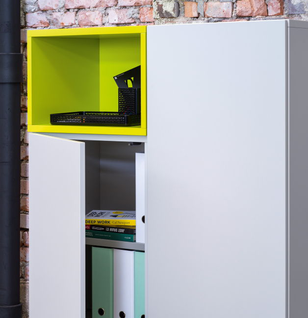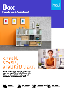 Die Box Regale sind in verschiedenen Ordnerhöhen, Breiten und Tiefen erhältlich. Ergänzungen wie pinnbare Rückwände, variable Sockellösungen und eine große Auswahl an Dekoren ermöglichen individuelle Konfigurationen von kompakten Unterbauten bis zu raumhohen Ordnungssystemen. Ob als Solitär oder in Kombination mit anderen Box Elementen, sie bieten maximale Freiheit für maßgeschneiderte Stauraumlösungen die mit deinem Büro mitwachsen.