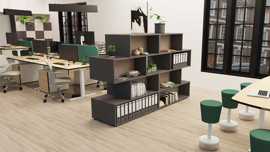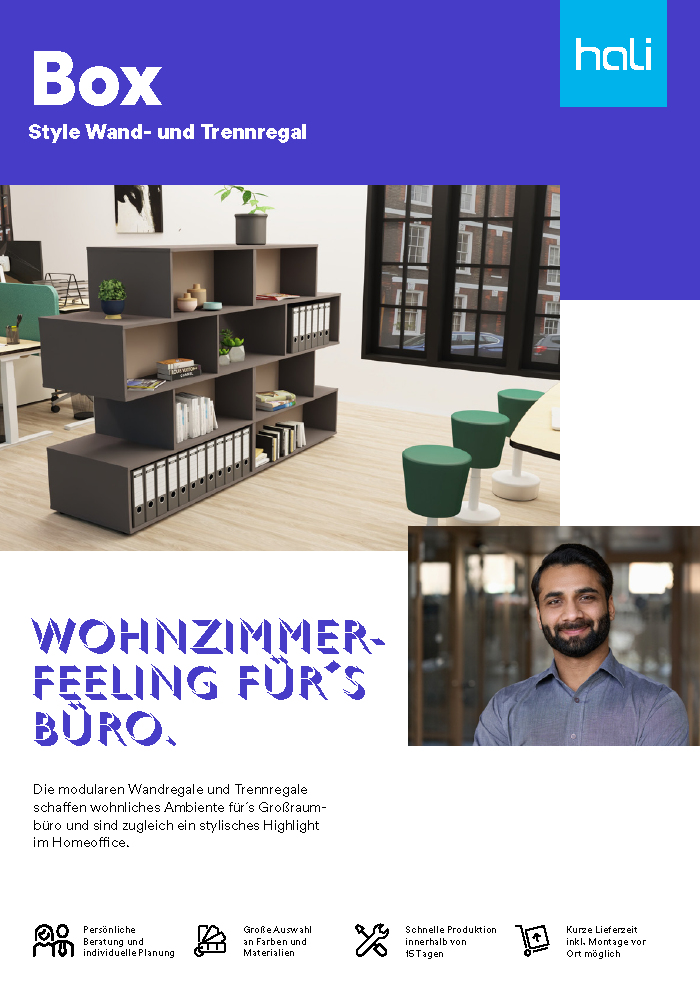 Das Box Style Wand- und Trennregal bringt ein Wohnzimmerfeeling in dein Büro. Ob als Wandregal, Ecklösung oder frei stehender Raumteiler – es schafft Struktur, Ordnung und wohnliches Ambiente im Büro.