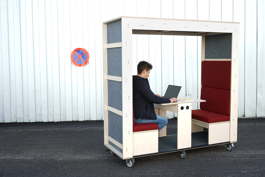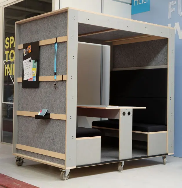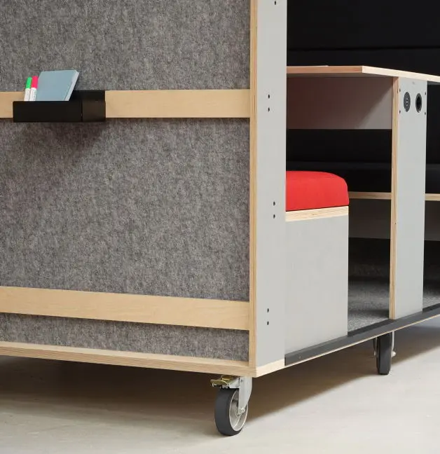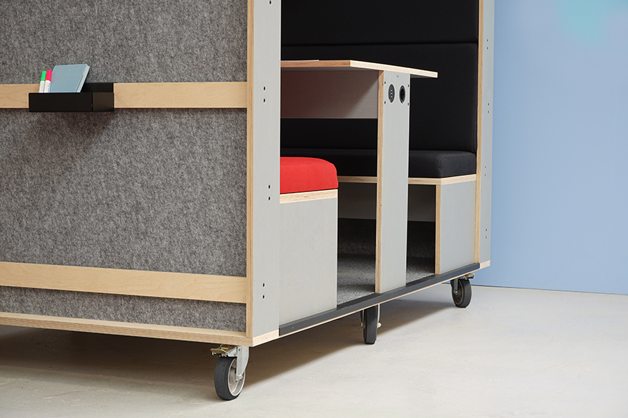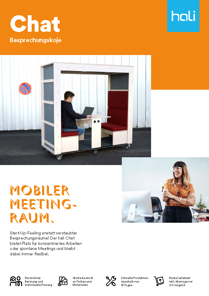 Die mobile Konstruktion auf Schwerlastrollen, LED-Beleuchtung mit Bewegungssensor und hochwertige Akustikelemente machen den Chat zu einem echten Allrounder. Praktische Extras wie Haken, Einhängeschalen und Magnettafel/Whiteboard lassen sich flexibel integrieren – für maximale Funktionalität auf minimalem Raum.