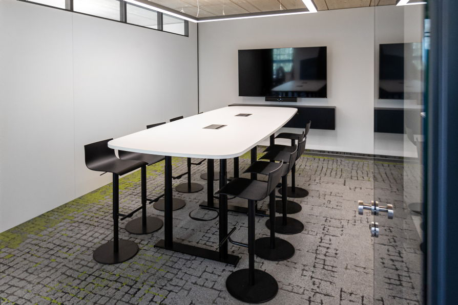 Moderner Meetingtisch, der sich nicht auf eine Höhe reduzieren lässt. Der Besprechungstisch m170 ist in einer Sitz-, Stehhöhe und elektrisch höhenverstellbar verfügbar.