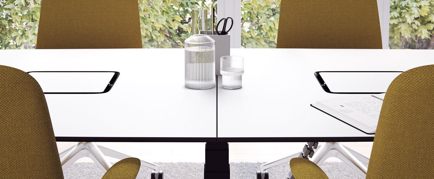Der Besprechungstisch m170 überzeugt mit modularer Vielfalt: Wahlweise mit runder oder quadratischer Säule, fix oder elektrisch höhenverstellbar. Seine flexiblen Maße machen ihn zum Allrounder für Besprechungszonen jeder Größe. Mit Breiten bis zu 5560 mm (geteilte Platte) bietet der m170 Platz für große Teams.