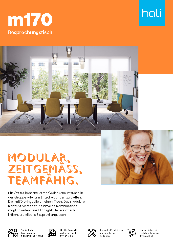 Die m170 Serie überzeugt mit vielfältigen Optionen: runde oder quadratische Hubsäulen, geteilte oder durchgehende Tischplatten und eine große Auswahl an Farben und Materialien. Die elektrische Höhenverstellung mit Anti-Kollisionssystem Piezo™ sorgt für ergonomisches Arbeiten, während clevere Kabelmanagement-Lösungen Ordnung und Übersicht garantieren.