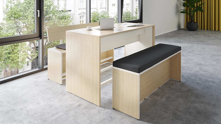 Ideal für Begegnungszonen, Pausenbereiche oder als starker Punkt im Raum. Die klaren Linien und die massive Bauweise schaffen Vertrauen und Präsenz. Auf Wunsch mit Fußreling ergänzt, wird daraus ein komfortabler Treffpunkt für informellen Austausch oder kreative Team-Sessions.