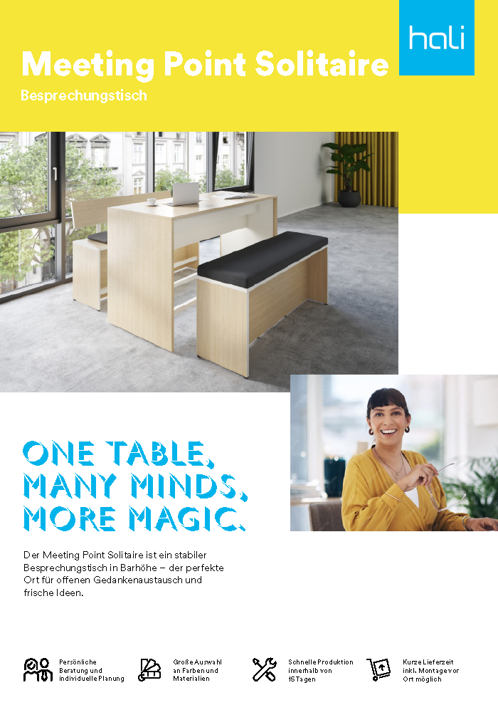 Der Meeting Point Solitaire steht wie eine Eins. Komplett aus hochwertiger Feinspanplatte gefertigt, überzeugt er durch Stabilität, Präsenz und eine monolithische Ästhetik. Er ist in den Höhen 1060 und 1150 mm verfügbar. Dieser Tisch ist mehr als eine Fläche – er ist ein Statement für Kommunikation auf Augenhöhe.