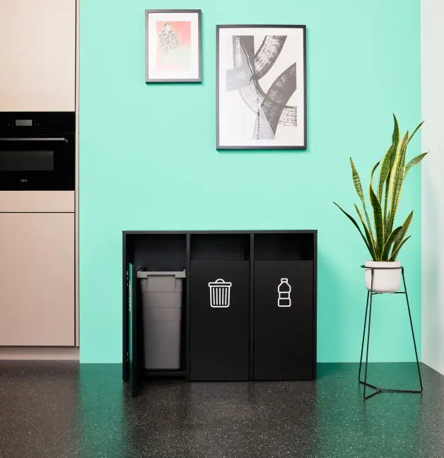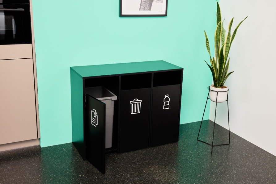 Der Korpus und die Türen sind in allen hali-Kollektionsfarben verfügbar. Das schlanke Design aus 19 mm Feinstpanplatte fügt sich elegant in jedes Interieur ein. Jeder Mülleinsatz besteht aus robustem Kunststoff mit 38 Litern Fassungsvermögen – ideal für ganze Abteilungen. Optional sind verschiedene Icons für Restmüll, Papier, Plastik, Metall, Glas und Bio als Beklebung wählbar – in Schwarz oder Weiß, passend zur Dekorfarbe.