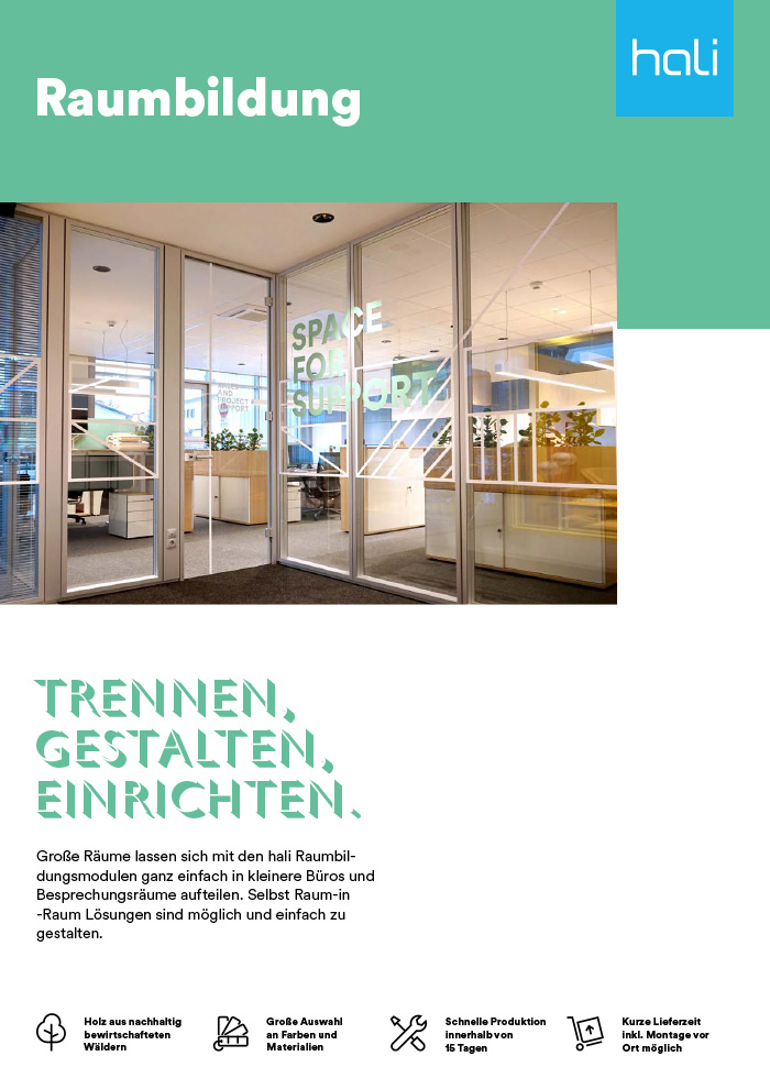 Die Raumtrennwand RS20 verwandelt offene Flächen in klare Zonen: Ob ruhiger Rückzugsort oder inspirierender Meetingraum – sie schafft Struktur, fördert Fokus und bringt modernes Design ins Office. Dabei bleibt sie so wandelbar wie dein Arbeitsalltag: verschiedene Höhen, Materialien und modulare Elemente ermöglichen maßgeschneiderte Lösungen für dein Büro. Ob aus Stoff, Glas oder melaminbeschichtet – mit der RS20 wird Raumgestaltung zum strategischen Tool. Sie unterstützt Teams beim konzentrierten Arbeiten, fördert Kommunikation und passt sich flexibel an neue Anforderungen an.