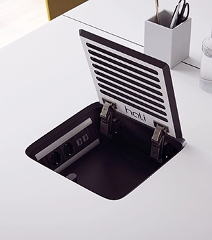Was die Tischserie s60 vereint, ist ihr optisches Erscheinungbild. Die 19 mm starke Tischplatte ist direkt mit dem Gestell verbunden. Alle sichtbaren Schraibverbindungen werden mit Abdeckkappen verdeckt und sorgen für einen cleanen Look. Alle Gestelle sind in Grau, Schiefergrau, Schwarz und Weiß verfügbar.