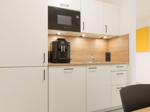 Zur BeratungUnser Küchenangebot umfasst nicht nur große Küchenlösungen – wir sind auch Experten darin, für selbst den kleinsten Raum die perfekte Küchenlösung zu kreieren. Unsere Teeküchen sind wahre Raumwunder: In ihnen finden Spüle und Müllsystem, Geschirrspüler, Kühlschrank mit Gefrierfach, Mikrowelle sowie ausreichend Stauraum ihren Platz. Selbst für die Kaffeemaschine ist vorgesorgt. Ein besonderes Detail sind die Wangen, die bis zur Arbeitsplatte reichen, wodurch die Küche auch aus der Seitenansicht stets aufgeräumt wirkt. Ideal für Büros, in denen jeder Quadratmeter zählt.