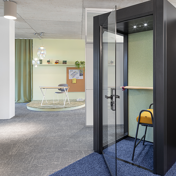 Eine Koje im Büro bedeutet maximale Flexibilität. Ob fest integriert oder mobil im Raum platziert, Besprechungskojen lassen sich leicht an neue Anforderungen anpassen. Mit Akustiklösungen, Beleuchtung und Belüftung schaffen sie ein angenehmes Umfeld für Ideen, Kreativität und Zusammenarbeit.