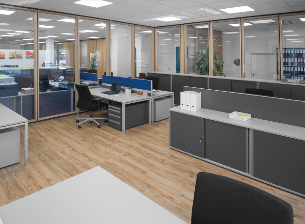 Die hellen, offenen Büroräume wurden mit Büromöbeln in Grautönen ausgestattet und zoniert. Farbliche Highlights in Grün und Blau sorgen für die notwendigen Akzente und schaffen eine ruhige und freundliche Atmosphäre. Benötigte Stauraummöbel wurden sowohl zur Abtrennung zwischen den Arbeitskojen als auch zur Schaffung von Gängen zwischen den Arbeitsbereichen eingesetzt. In die Länge gezogene Meetingpoints bieten sowohl Platz für kurze Gespräche zwischen den Mitarbeiter*innen als auch Abstellfläche für Büroutensilien, Pflanzen oder Dekor.