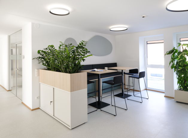 Für die notwendige Trennung von Kommunikationszone und Gang sorgt eine Kombination von Schiebetürenschrank mit Blumenwannen-Aufsatz. Diese bringt zusätzliche Frische in das Raumkonzept und macht die offene Zone, durch die schalldämmende Wirkung der Pflanzen, zu einem angenehmen Treffpunkt für Mitarbeiter*innen.