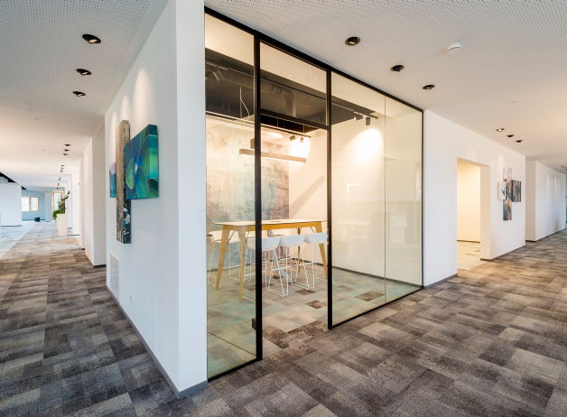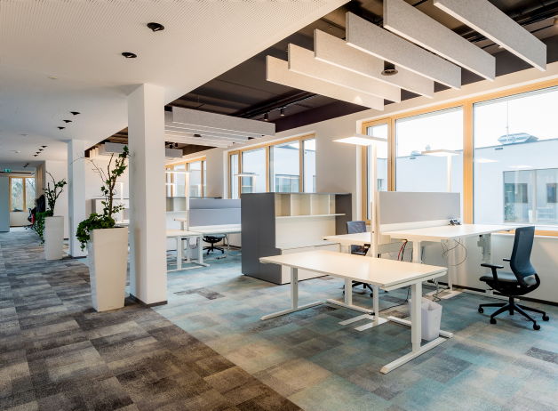 Die offenen Arbeitsräume wurden durch Schiebetürenschränke oder eine Regal-Schiebetürschrank-Kombinationen getrennt. Da es bei vielen Mitarbeiterinnen und Mitarbeitern im selben Raum sehr laut werden kann, wurde zusätzlicher Wert auf Akustik-Paneele gelegt, die –ebenfalls in Weiß gehalten – über den Arbeitsplätzen der Mitarbeitenden von der Decke hängen.