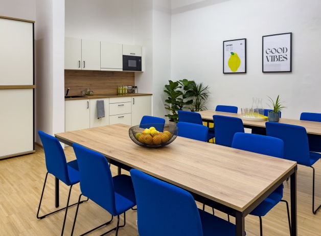 Als verbindendes Element im Büroalltag wurde eine Cafeteria mit Küchenzeile und großzügigen Sitzmöglichkeiten umgesetzt. Die Tische lassen sich je nach Bedarf kombinieren und schaffen Raum für gemeinsame Pausen, informelle Gespräche oder kleinere Teamrunden. Die Büroküche ist bewusst offen und einladend gestaltet – ein Ort, der den sozialen Austausch stärkt und den Arbeitsalltag auflockert.