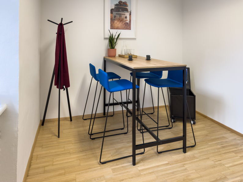 Ergänzt wird das Konzept durch einen zweiten Meetingraum mit Stehtisch, der sich ideal für kurze Abstimmungen und dynamische Meetings eignet. Die klare Formensprache und die ruhige Gestaltung schaffen eine Atmosphäre, in der Kommunikation im Mittelpunkt steht.