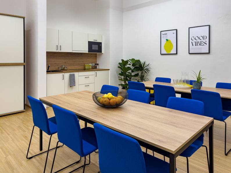Als verbindendes Element im Büroalltag wurde eine Cafeteria mit Küchenzeile und großzügigen Sitzmöglichkeiten umgesetzt. Die Tische lassen sich je nach Bedarf kombinieren und schaffen Raum für gemeinsame Pausen, informelle Gespräche oder kleinere Teamrunden. Die Büroküche ist bewusst offen und einladend gestaltet – ein Ort, der den sozialen Austausch stärkt und den Arbeitsalltag auflockert.
