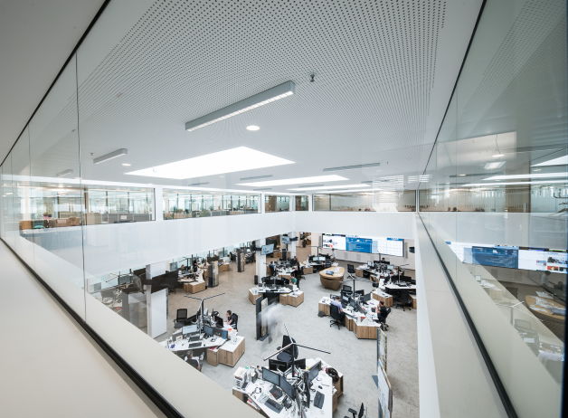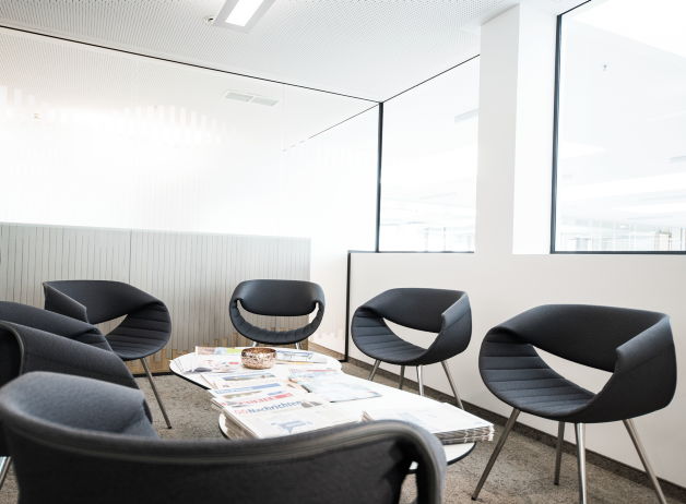 Meetingräume wurden mit großen Besprechungstischen, den passenden Konferenzdrehsesseln, höhenverstellbaren Stehtischen sowie einem individuellen Bistrotisch in Sonderform eingerichtet. Der Auftrag umfasste auch das Kabelmanagement im Großraumbüro.