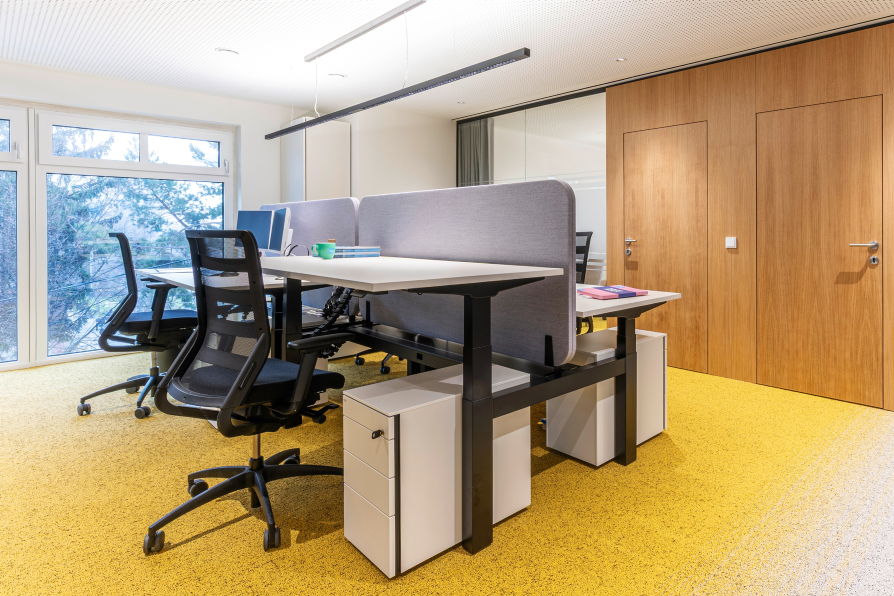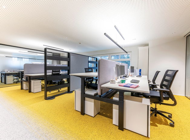 Die Open-Office-Bereiche sind klar gegliedert und auf effizientes Teamwork ausgelegt. Die ergonomische Sitz-Steh-Tische ermöglichen flexibles Arbeiten und fördern Bewegung im Arbeitsalltag. Für Rückzug und konzentrierte Gespräche sorgen die Besprechungskojen Framery, die akustische Ruhe in der offenen Struktur schaffen und so die Arbeitsqualität erhöhen.