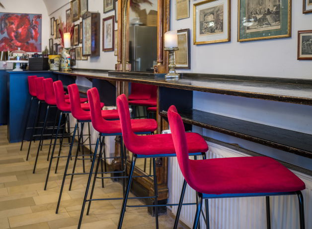 Das Resas bietet mit seinem extravaganten Dekor einiges zu sehen. Alte Bilder und Dokumente in extravaganten Rahmen zieren die Wände. Hinter der Bar reihen sich silberne Kaffeebrühgefäße in allen Formen und Varianten. Passend dazu die mit roten Samtstoff überzogenen Barhocker zur schwarzen Holztheke, an der sich Gäste zum Kaffee oder einem Aperitif niederlassen können. Das stimmige Interior lädt zum Verweilen ein.