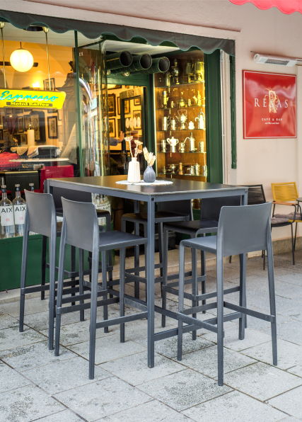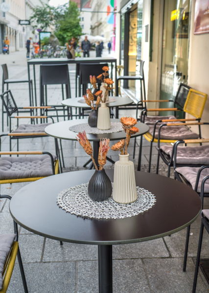An warmen Tagen können Gäste auch im Outdoorbereich direkt vor dem Resas Platz nehmen. Die schwarzen Rundtische und der lange Stehtisch mit wetterfesten Barhockern schaffen Platz für Treffen zu zweit oder für kleinere Gruppen. Von hier aus lässt sich das bunte Treiben der Passanten beobachten oder spannende Gespräche mit Kollegen oder Bekannten führen.