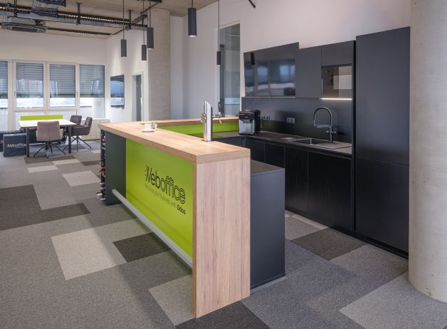 Die neue Mitarbeiterküche verbindet modernes Design mit hoher Alltagstauglichkeit. Schwarze Fronten, warme Holzdetails und das frische Grün im CI-Look schaffen einen charakterstarken Mittelpunkt für Pausen und kurze Meetings. Ein besonderes Highlight: der integrierte (Bier-)Zapfhahn, der für Team-Events und After-Work-Momente gerne genutzt wird. Die grifflose Küche bietet viel Stauraum, hochwertige Arbeitsflächen und eine klare Linienführung – ein funktionaler Ort für Genuss, Austausch und Gemeinschaft.